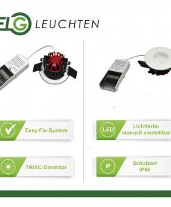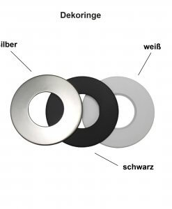 Es können drei Dekoringe eingesetzt werden (Weiß, Schwarz, Silber). Diese können durch einen Bajonettverschluss gewechselt werden. Durch die verschiedenen Dekoringe haben Sie die Möglichkeit das Downlight zu Ihrem Belieben einzusetzen.