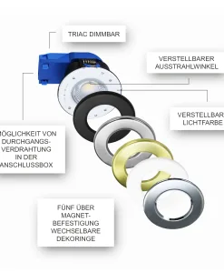 Die LED Leuchte ist TRIAC dimmbar und über die rückseitige Anschlussbox durchgangsverdrahtbar. Zusätzlich kann der Abstrahlwinkel durch einen leichten Druck auf die LED zwischen 36° und 60° eingestellt werden. So entsteht eine individuelle Lichtatmosphäre.