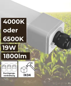 Hohe Lichtleistung: Unsere LED Feuchtraumleuchte mit 60cm Länge, 19W Leistung und 1800lm sorgt diese LED Deckenleuchte lang für eine sehr helle LED Beleuchtung. Ideal für Schweine- und Kuhställe, um eine effiziente Arbeitsumgebung zu schaffen.