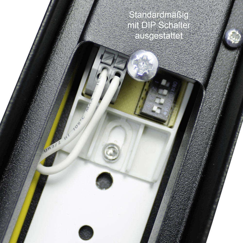 Durch den standardmäßig integrierten DIP Schalter kann der Lumen Wert und Stromfluss selbstständig eingestellt werden. Dimmbar über DALI oder 1-10 Volt (5 Zuleitungen). Das macht die LED Anbauleuchte sehr effizient. Die Leuchte besteht aus hochwertigen LED Komponenten mit einem Lumen Wert von 5800lm, 44W und einer Lichtfarbe von 4000K (Neutralweiß). Die LED Leuchte ist mit 131 lm/W sehr sparsam, effizient und umweltschonend, im Gegensatz zu herkömmlichen Lampen. Zudem weist die Leuchte eine langlebige Lebensdauer von 50.000 Betriebsstunden auf.