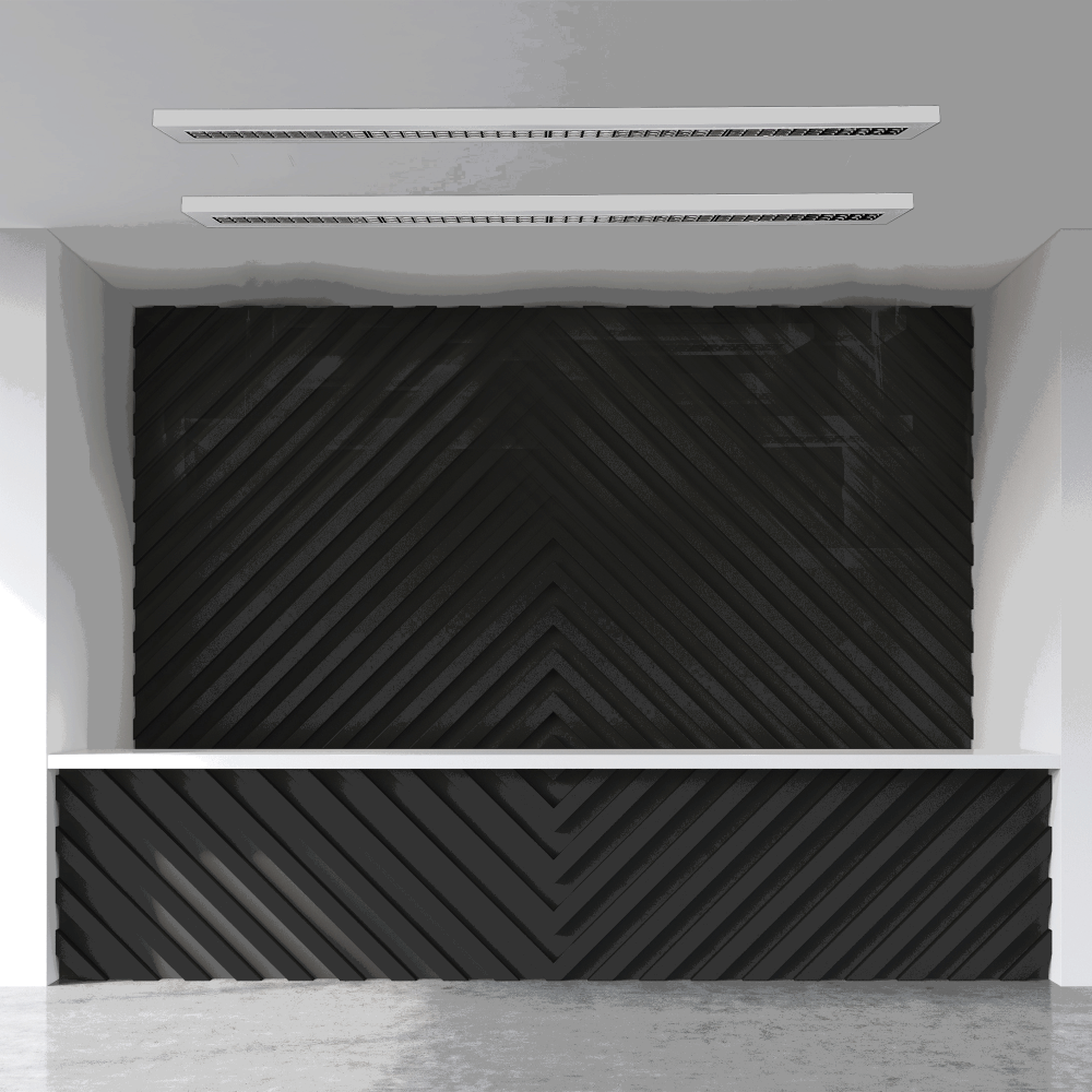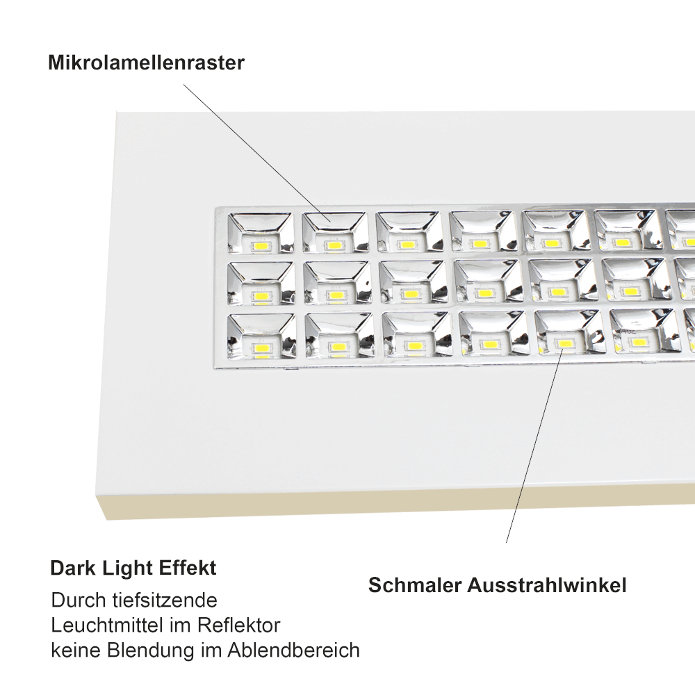 Hochwertige LED Rasteranbauleuchte Mit Mikrolamellenraster aus Aluminium hochglänzend mit schmalem Ausstrahlwinkel. In 4 Varianten erhältlich (120cm/36W und 150cm/45W),(Anbau oder Pendel). Konzipiert für den Einsatz in Büros mit Bildschirmarbeitsplätzen – Durch den sogenannten Dark Light Effekt, wird durch die tiefsitzenden Leuchtmittel im Reflektor keine Blendung im Abblendbreich erzeugt. Bevor Sie das Leuchtmittel nicht erkennen können erfolgt auch keine direkte Blendung.