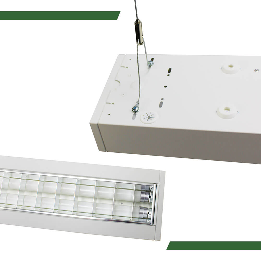 - Die Hochwertige Rasteranbauleuchte ist aus weißem Stahlblech und kann durch eine Aufputzmontage ganz einfach direkt an der Decke angebracht werden oder man pendelt sie ab (Seilaufhängungen nicht enthalten) . Ihre schmale, elegante Form passt sich ideal den Räumen an und ist ein echter Hingucker.