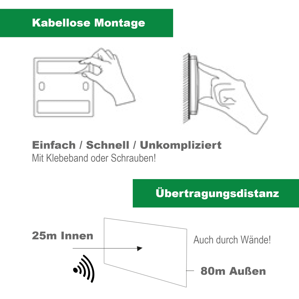 Der kinetische Funkschalter erzeugt durch den Druck auf den Schalter ein Signal, welches dann an den Empfänger gesendet wird (Beides im Preis enthalten). Auch Wände stellen dabei kein Hindernis da. Die Übertragungsdistanz beträgt innen (indoor) 25m und außen (outdoor) 80m.