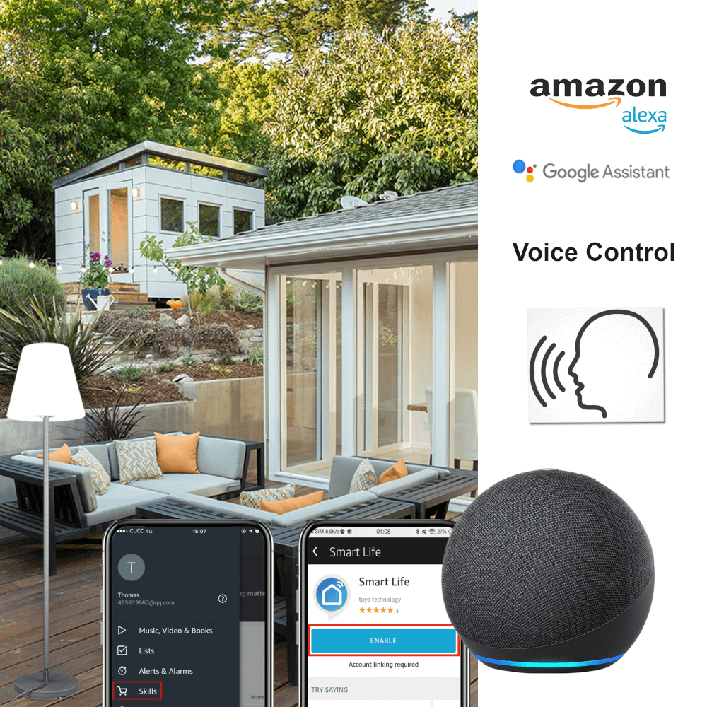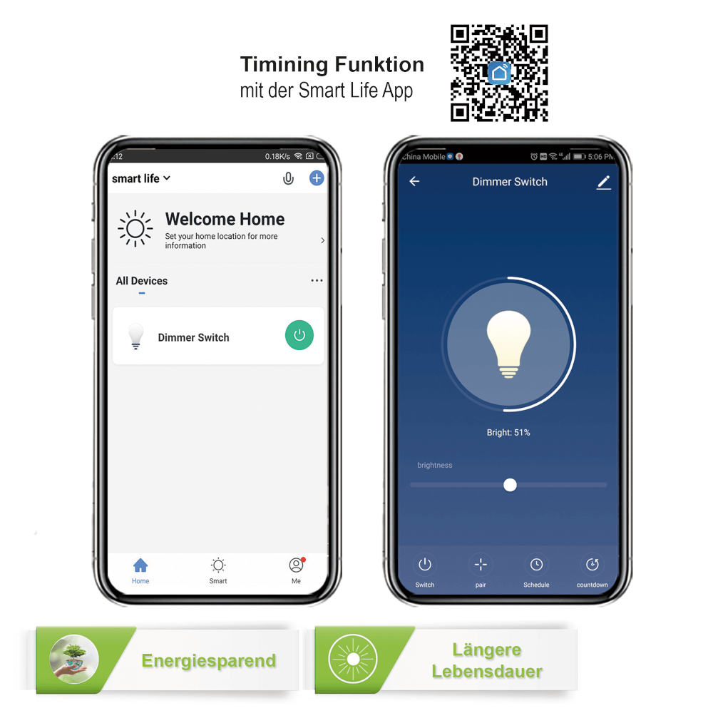 Die Steuerung des Funkschaltersetz erfolgt über die App "Smart Life". In Kombination mit der App ist auch die "Amazon Alexa App" nutzbar. Eine Kopplung mit dem Amazon Echo oder Google Assist ist auch möglich. Nach der Kopplung können Sie ganz einfach einen Sprachbefehl geben und das Licht wird an und ausgeschaltet und bei dimmfähigen Leuchten sogar gedimmt.
