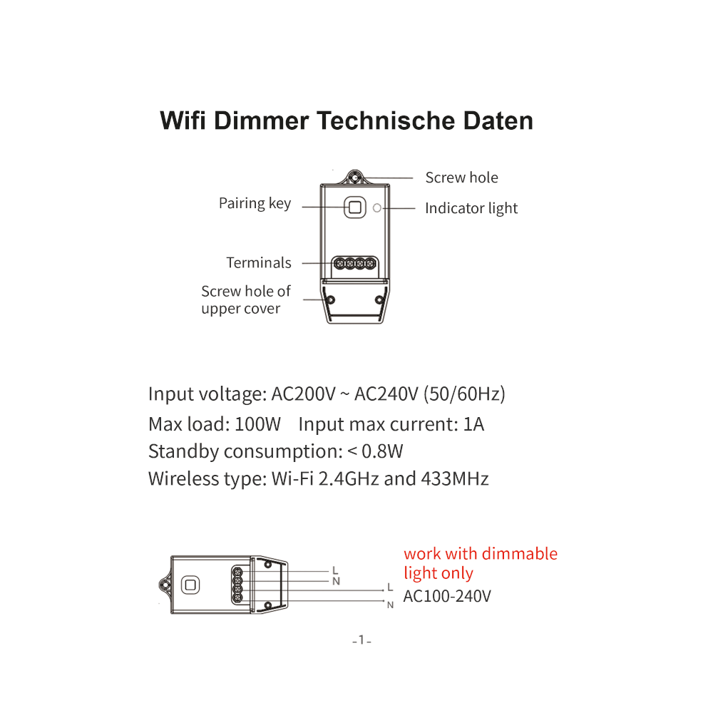 Die Maße der Funkschalter betragen: 8,6 x 8,6 x 1,5cm und hat einen Lebensdauer von 200.000 Schaltungen. Durch die Betriebstemperatur beträgt -10°C – 50°C. Empfänger Maße: 8,8 x 4,1 x 3,1 cm, Max. Belastung: 100W, Eingangsmaximalstrom:1A, Eingangsspannung: AC100V – AC240V (50/60Hz),Max Load: 250W/ch,110V, 500W/ch,500W/ch, 220V Standby Verbrauch: <0,8W, Wifi Typ: 2,4GHz und 433MHz. CE-Zertifiziert. Ein Empfänger kann mit bis zu 10 Schaltern gekoppelt werden.