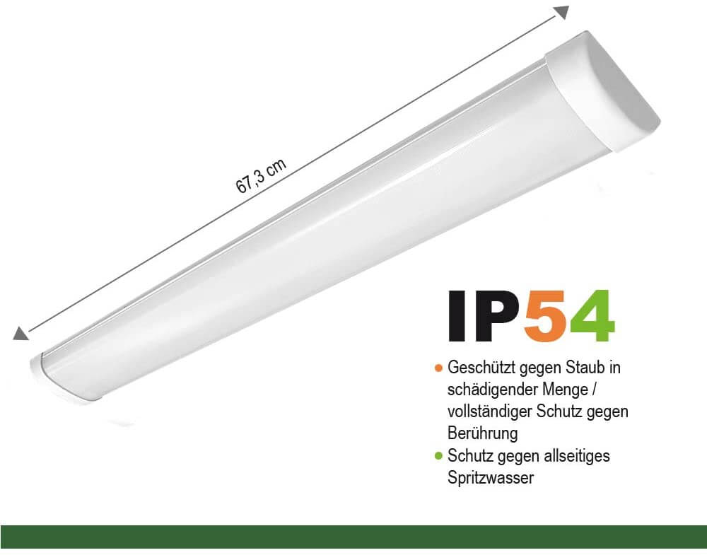 Die LED Feuchtraumleuchte hat eine weiße, opale Abdeckung aus PMMA. Die Leuchte ist mit IP54 staub- und gegen Spritzwasser aus allen Richtungen geschützt. Die Endkappen der Leuchten sind aus einem weißem ABS. Die Abmessung der Leuchte beträgt: 67.3 x 16.2 x 7.2 cm.