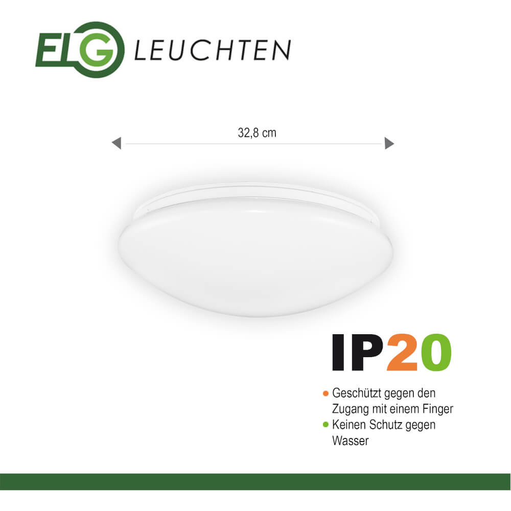Die Opalglasleuchte kann als Wand-/ oder Deckenleuchte montiert werden und verfügt über die Schutzklasse IP20. Diese Leuchte ist auch als IP44 Variante und mit Bewegungsmelder erhältlich.
